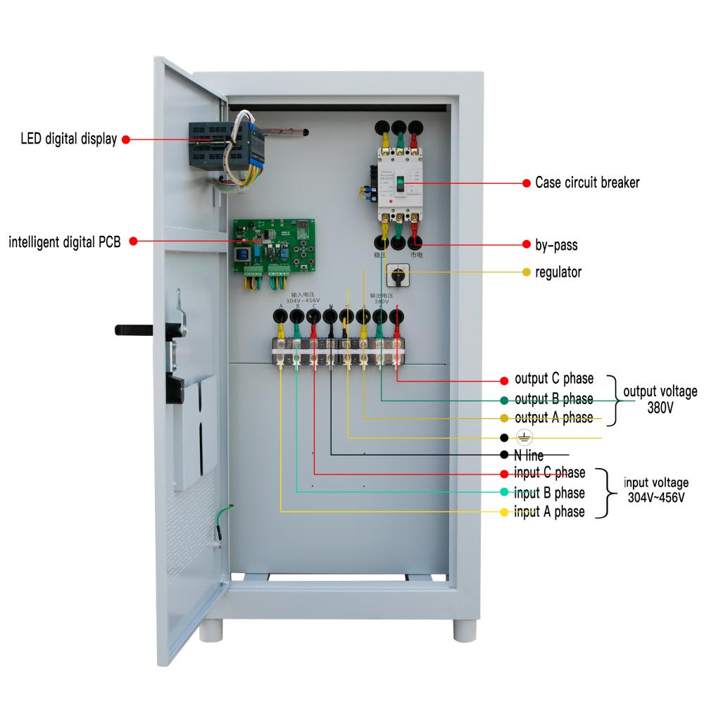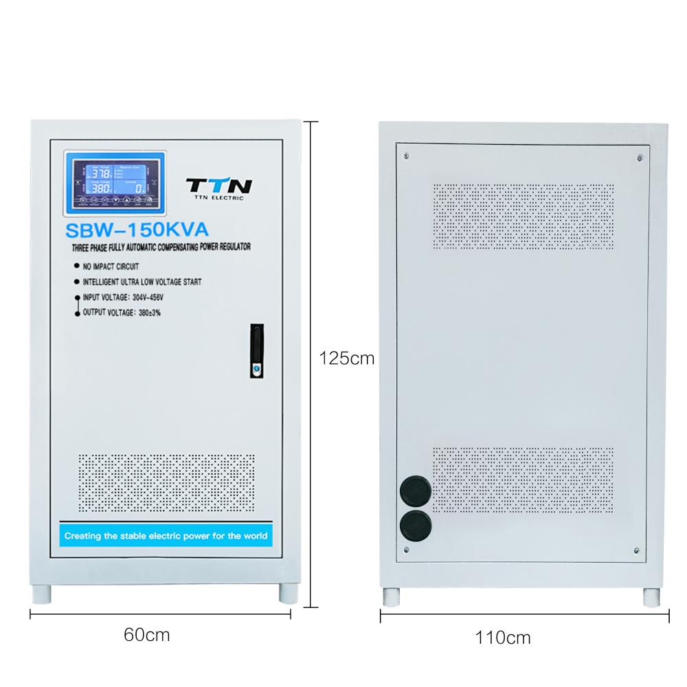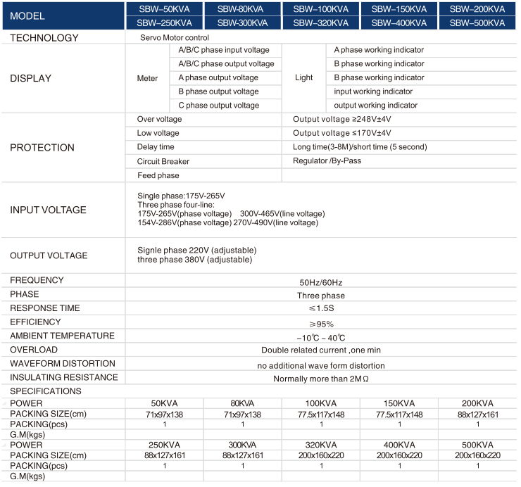 SBW-50KVA SBW-80KVA SBW-100KVA SBW-150KVA SBW-180KVA SBW-200KVA SBW-250KVA SBW-320KVA SBW-400KVA SBW-500KVA 1.Three Phase Compensation Servo motor control voltage stabilizer 2.Input voltage :AC 300-465V/AC 270-465V 3.LCD Digital display 4.Low voltage protection (ouput voltage <185V+/-5V), Over voltage protection (output voltage >245v+/-5v),over loading >110%,over heating >100℃